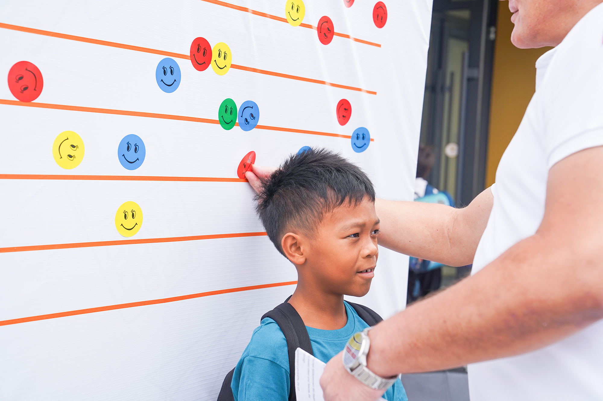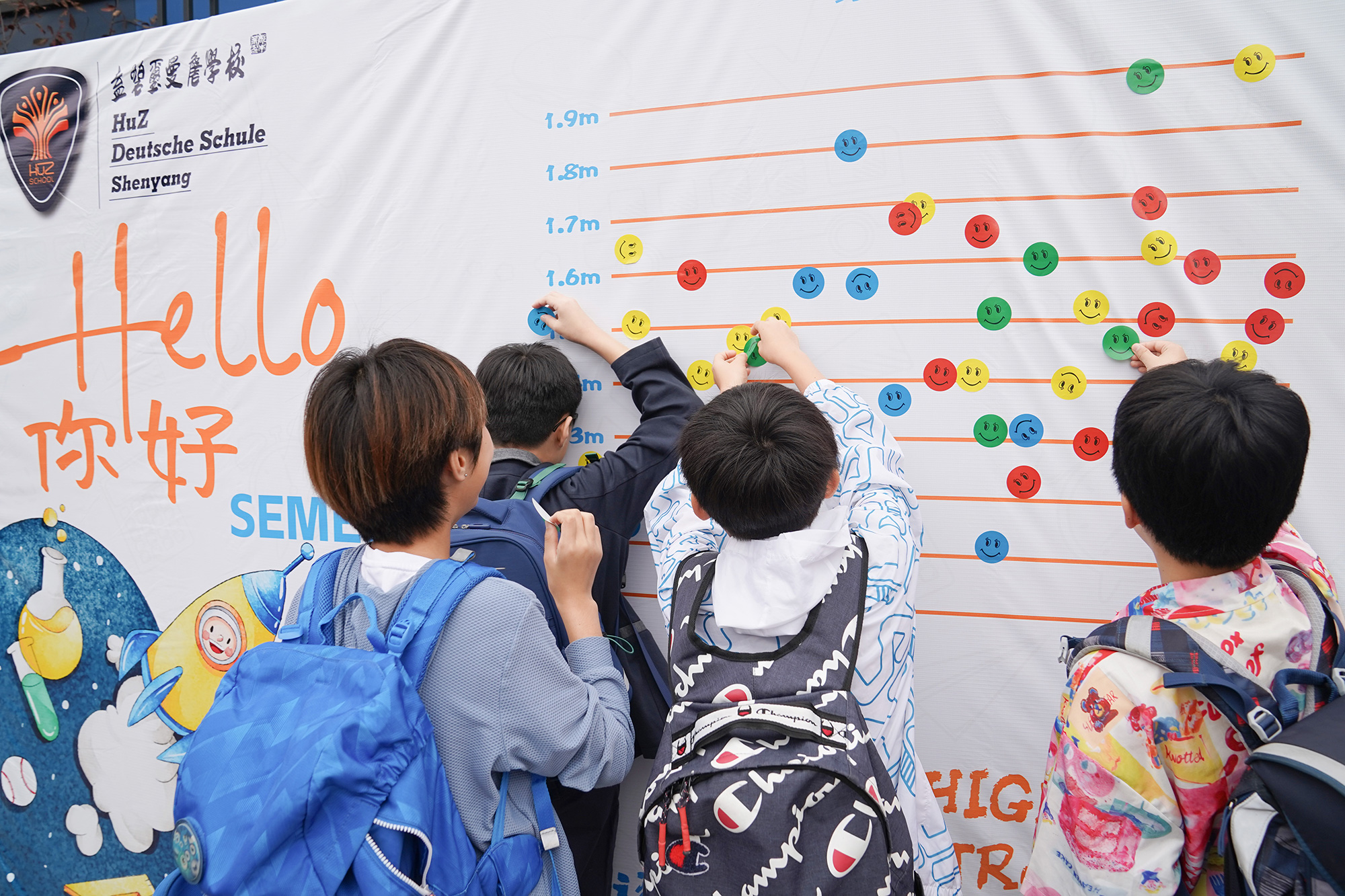 教学楼前的 “身高签到板”吸引着大家的目光并驻足。学生们每一个贴纸的落下,不仅是一次简单的入学签到,更是对成长的见证 —— 那些悄然增长的身高,藏着过去一年的努力与蜕变,也预示着新学期里即将开启的新旅程。