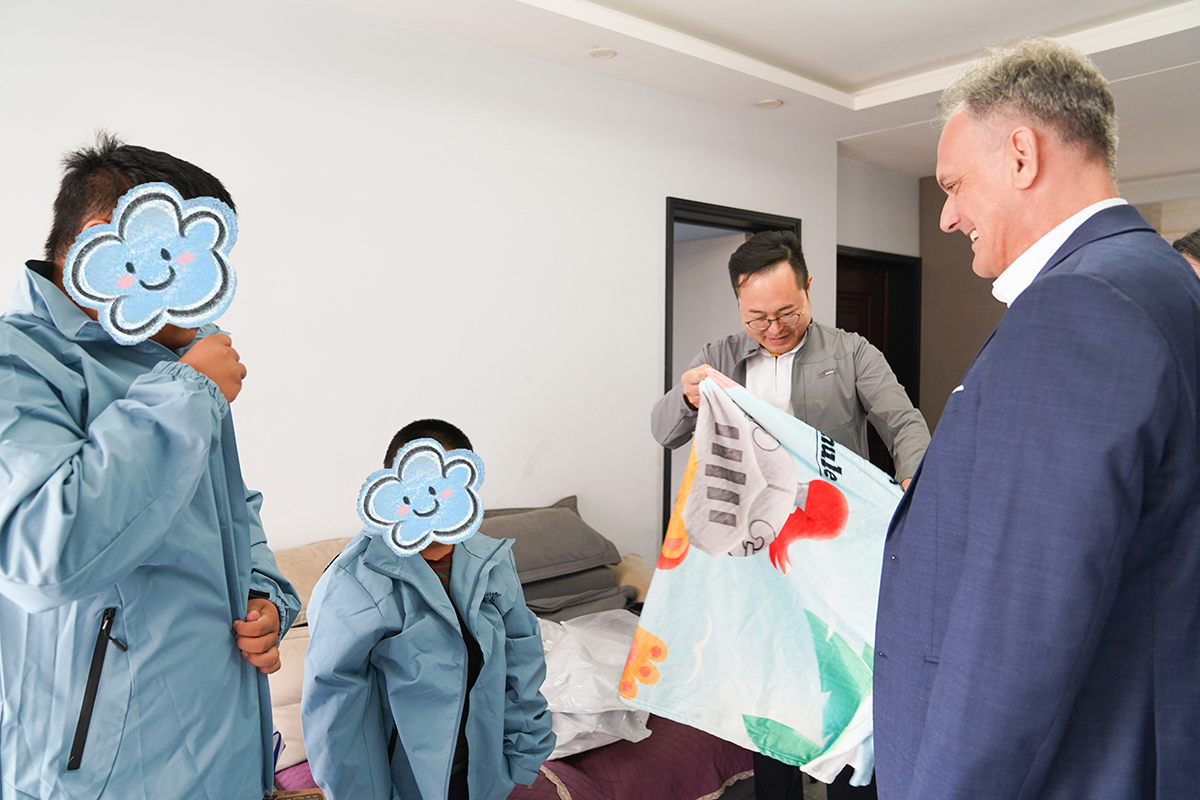 探访过程中,大家与孩子们一起玩起了桌游,客厅里回荡着久违的欢声笑语;亲手为孩子们披上崭新的冲锋衣,递过温暖的毛毯,叮嘱他们注意保暖;将马克笔交到他们手中,鼓励他们用画笔描绘眼中的世界、心中的梦想。临走时,孩子们依依不舍,轻声表达着对下一次来访的期待。这份纯粹的期盼,也让在场的每一个人更加坚信,公益不仅是物资的捐助,更是情感的陪伴与心灵的慰藉。