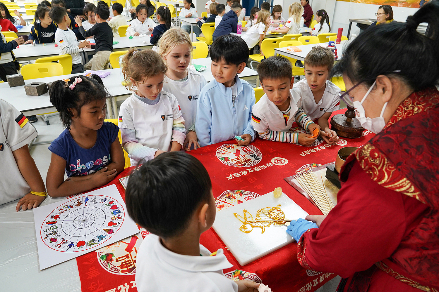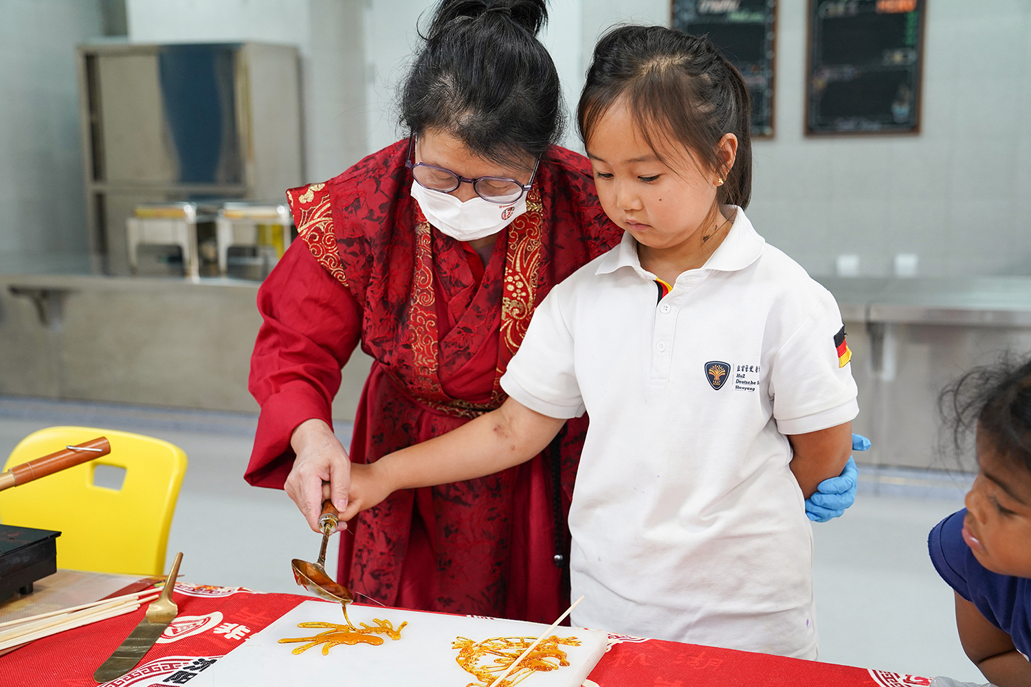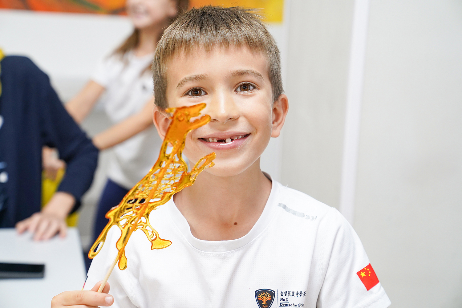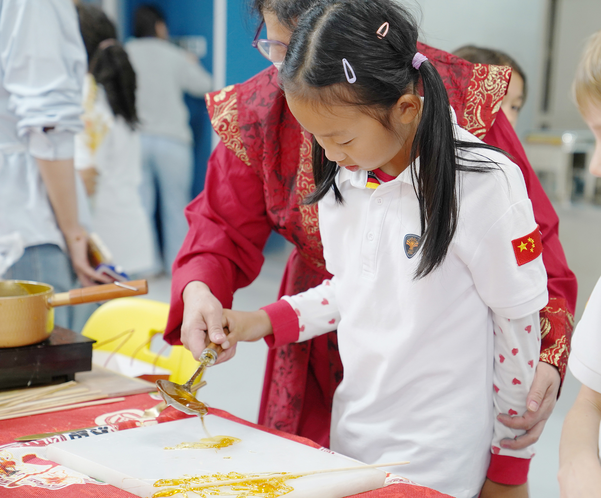 当融化的糖液在石板上缓缓流淌,勾勒出灵动的花鸟、憨态的生肖,晶莹的糖丝不仅凝结着甜蜜,更串联起一段跨越国界的文化对话。近日,盍碧玺曼詹学校迎来了一位特殊的 “老师”—— 李氏糖人代表性传承人李凤艳老师,她带着承载着百年技艺的糖画工具,为中德学生开启了一场沉浸式的非遗文化体验课,让大家在香甜中触摸中国传统文化的温度。
