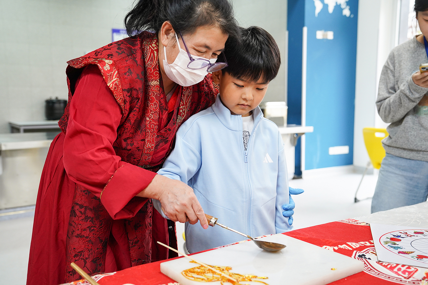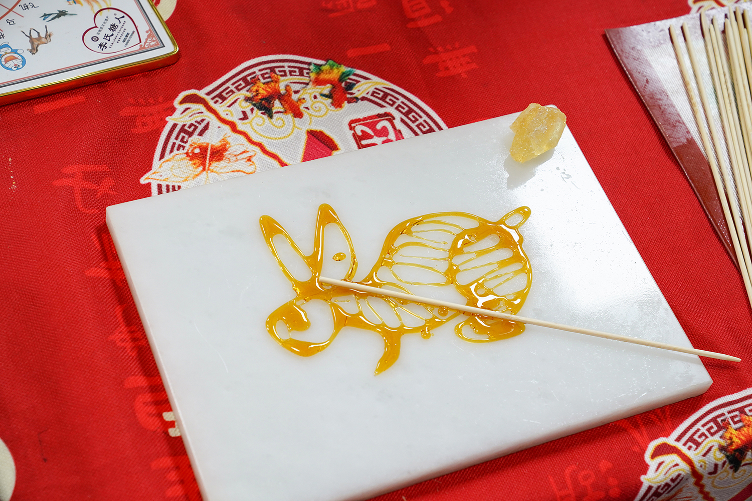 在体验环节,李老师耐心指导,大家小心翼翼地尝试勾勒线条、填充图案。在场的学生们纷纷屏住呼吸,眼中满是惊叹。糖画不仅是一门手艺,更承载着中国人的生活智慧:过去,街头的糖画艺人用一勺糖就能让孩子们收获一整天的快乐,如今,这门技艺更成为了连接传统与现代、中国与世界的桥梁。很多小朋友次看到糖画,都会被它的美所吸引,这就是文化的力量。