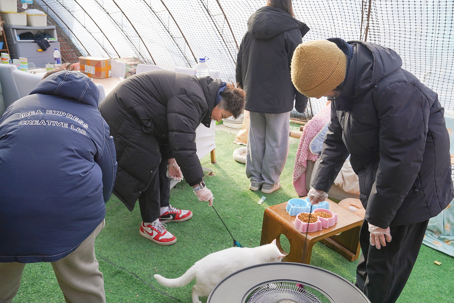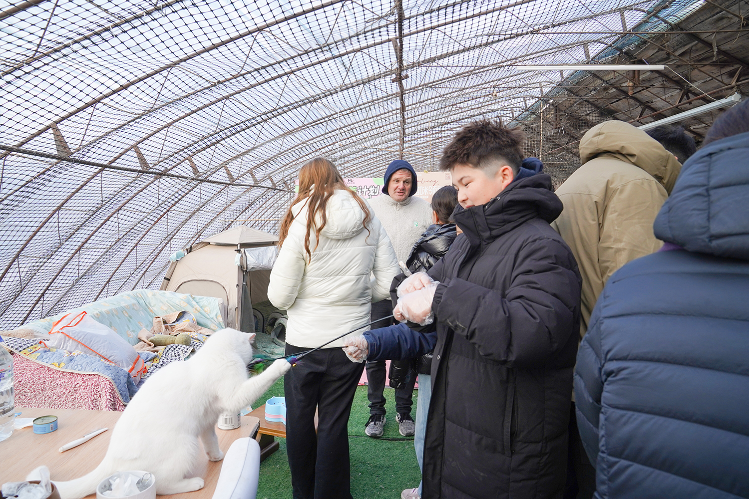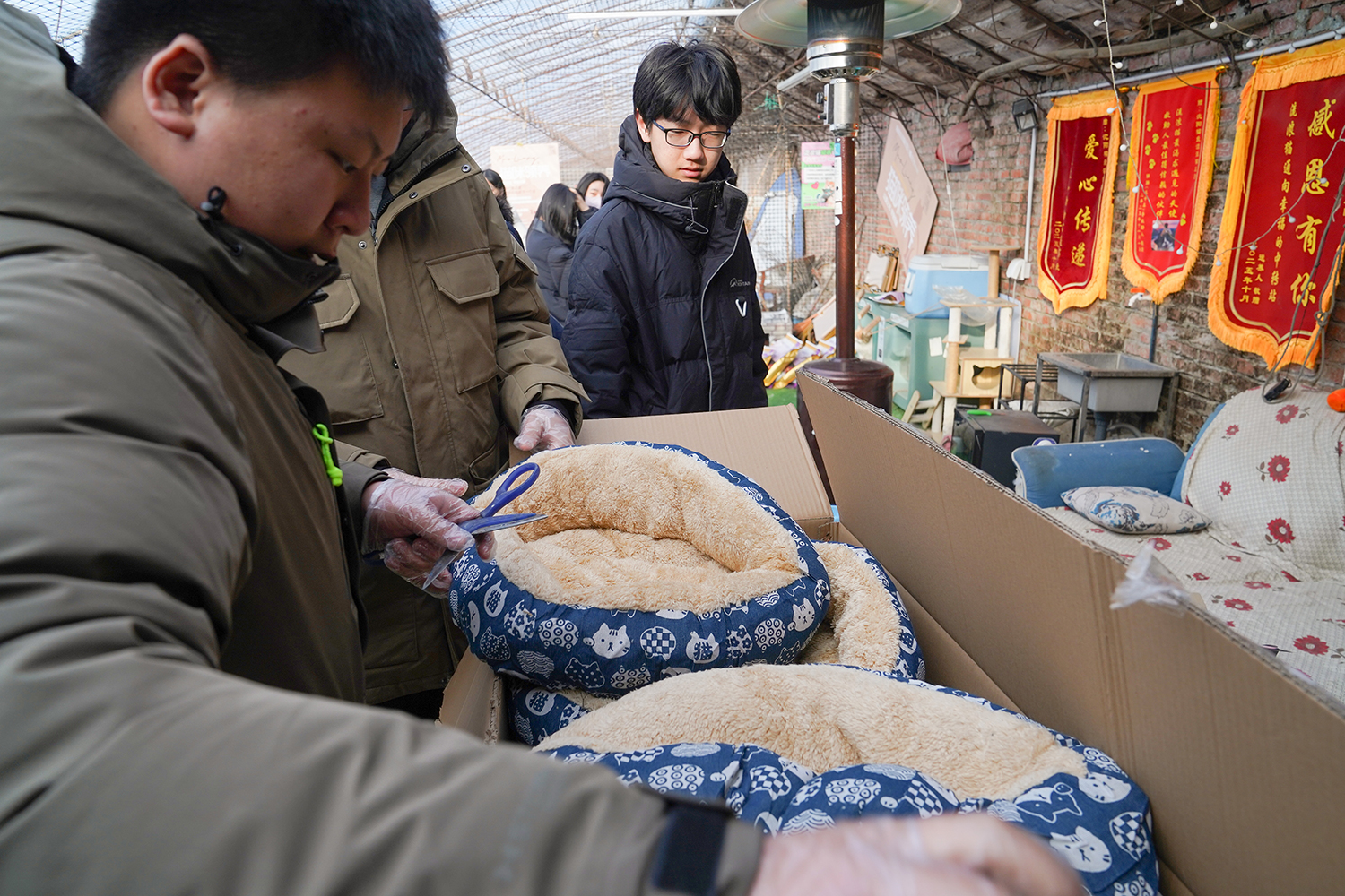 同学们用汗水换来的善款未曾被辜负,2月5日,我们精心采购了猫粮、猫罐头、保暖猫窝等物资,带着沉甸甸的爱心前往救助基地,开启一场双向治愈的邂逅。