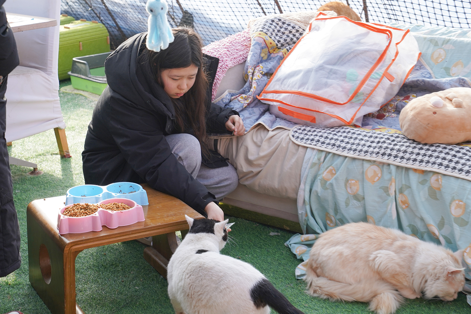 大家分工协作,搬运物资,投喂互动,这些猫咪大多曾被遗弃或虐待,万幸来到救助站后,性格才愈发活泼,身体也日渐恢复健康。同学们温柔陪伴、轻轻抚摸,在人与动物的纯粹羁绊中相互温暖。除此之外,同学们还整理基地、打扫卫生,为毛孩子们营造干净舒适的生活环境。