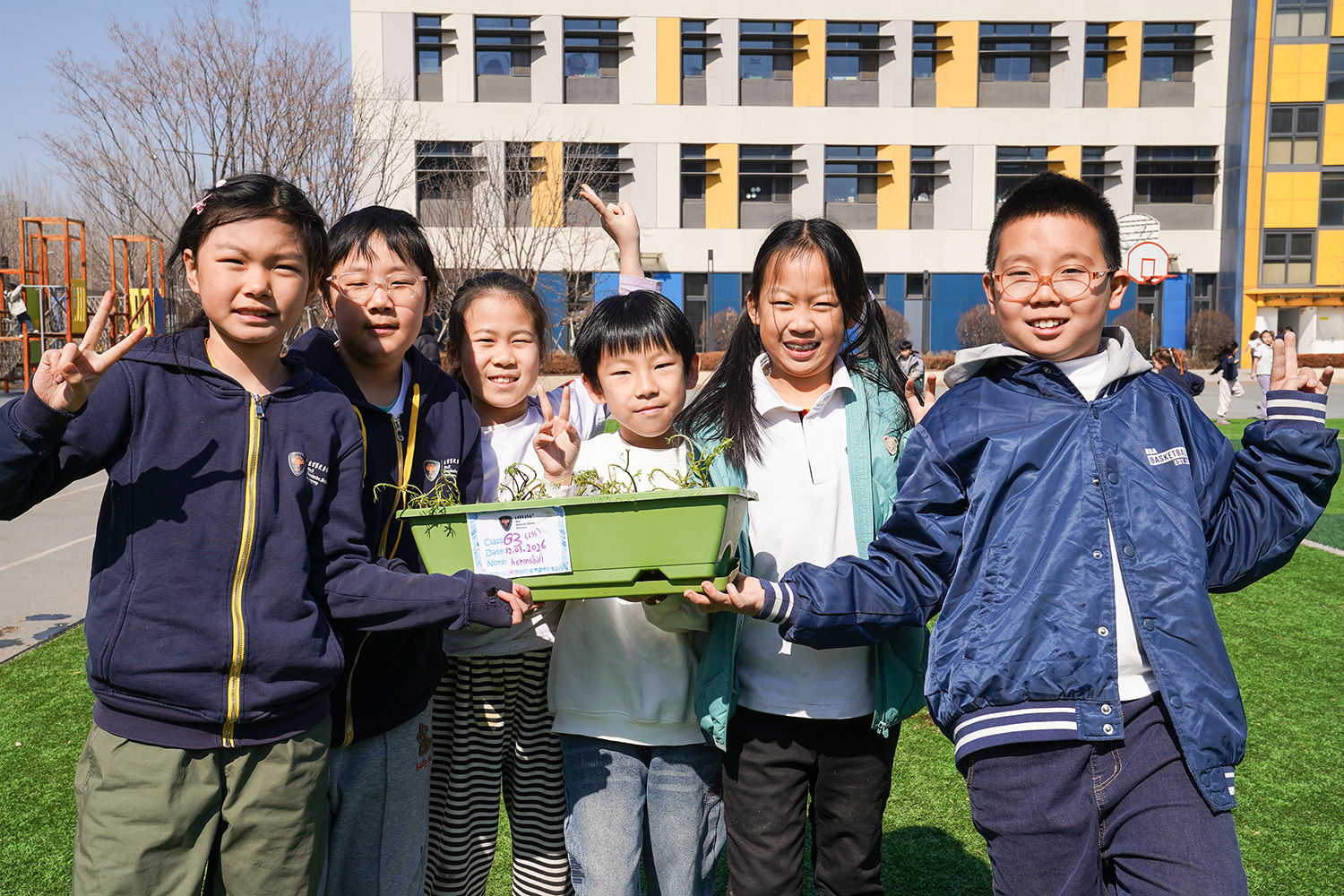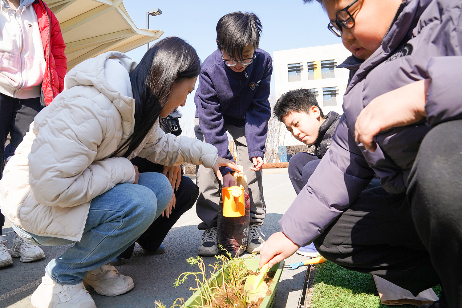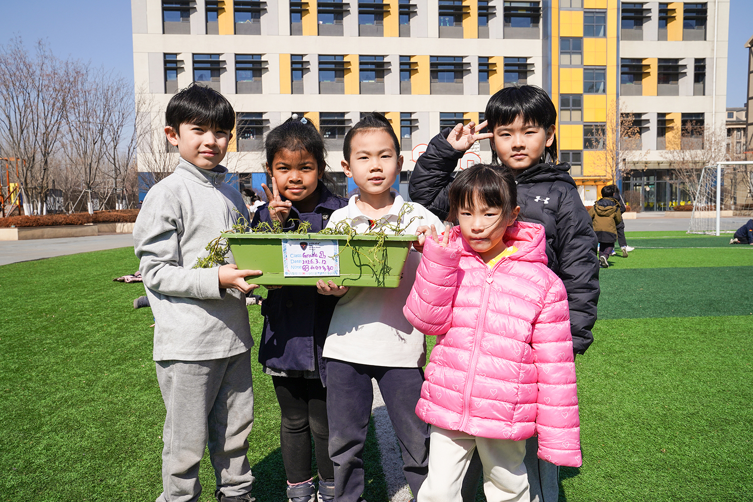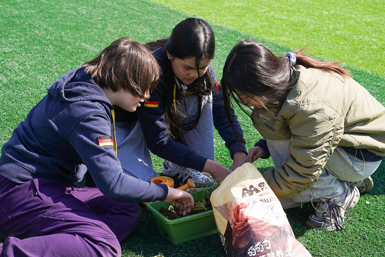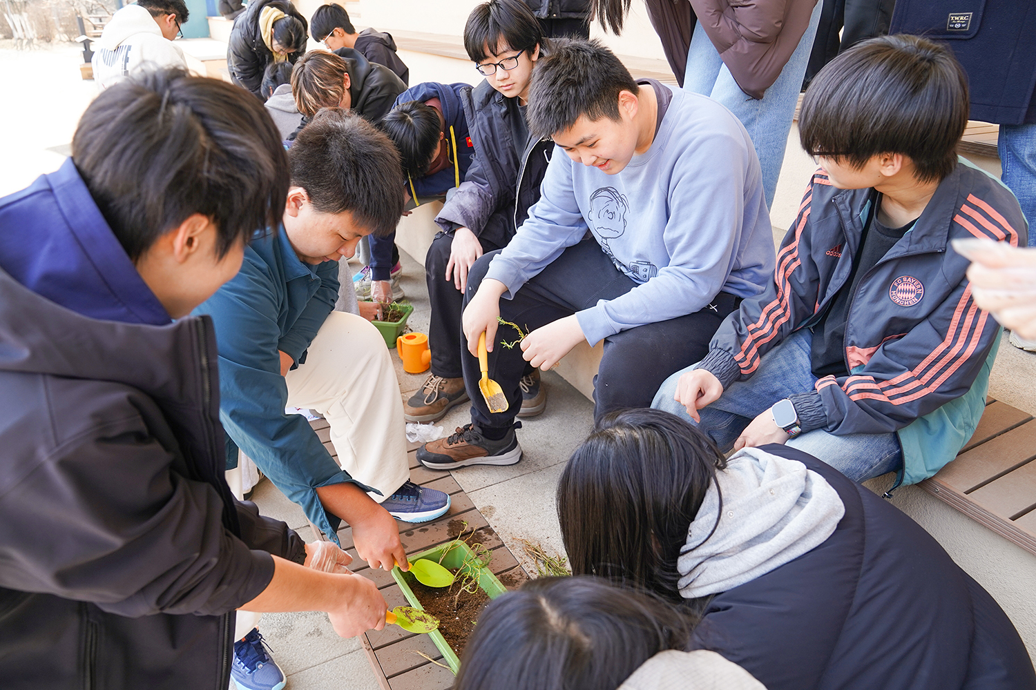 各班级有序分组、合理分工,将多元协作的理念融入每一个细节。孩子们围聚在一起,在老师的引导下,有序领取花盆、花土与花苗,没有语言的隔阂,唯有默契的配合。阳光下,孩子们俯身劳作,指尖沾染泥土的芬芳,眼神里满是专注与期待。师生们分享种植的喜悦,诉说对春天的向往,把对自然的热爱、对友谊的珍视,一同埋进温润的泥土里,让希望与绿植一同生根。